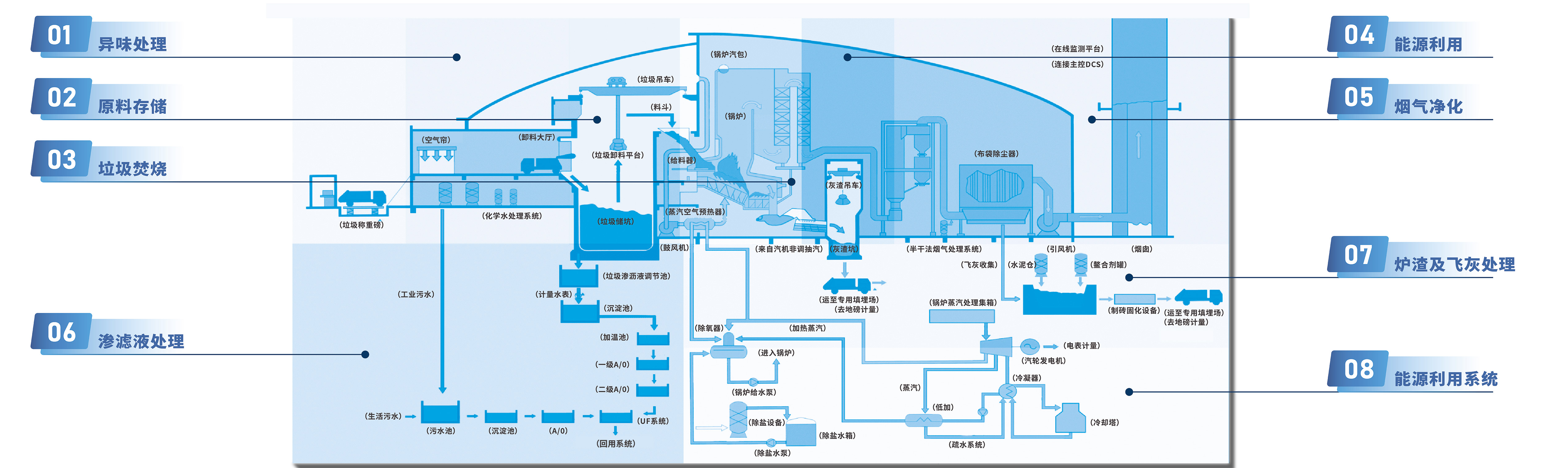 九游ninegame环境生活垃圾焚烧发电处理模式将全流程划分为八大模块,构建囊括垃圾入库、储存、焚烧,烟气净化、渗滤液处理、炉渣及飞灰处理、热能产生、能源利用的八大系统。
